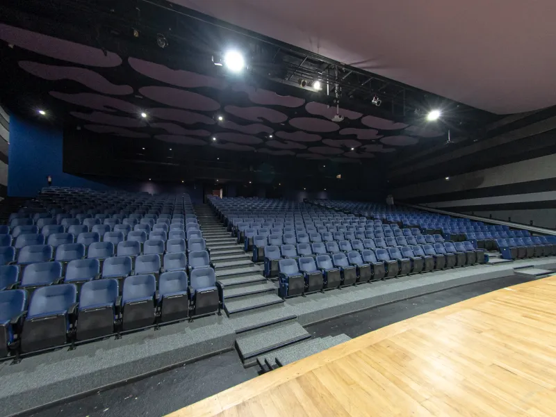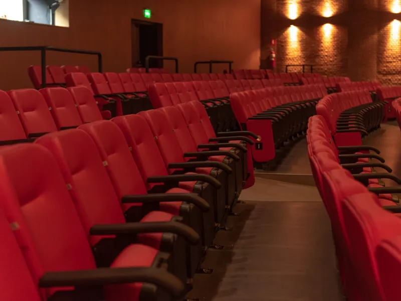 Poltronas estofadas com encosto alto, braços anatômicos e assento rebatível. Ideal para auditórios corporativos e universidades.